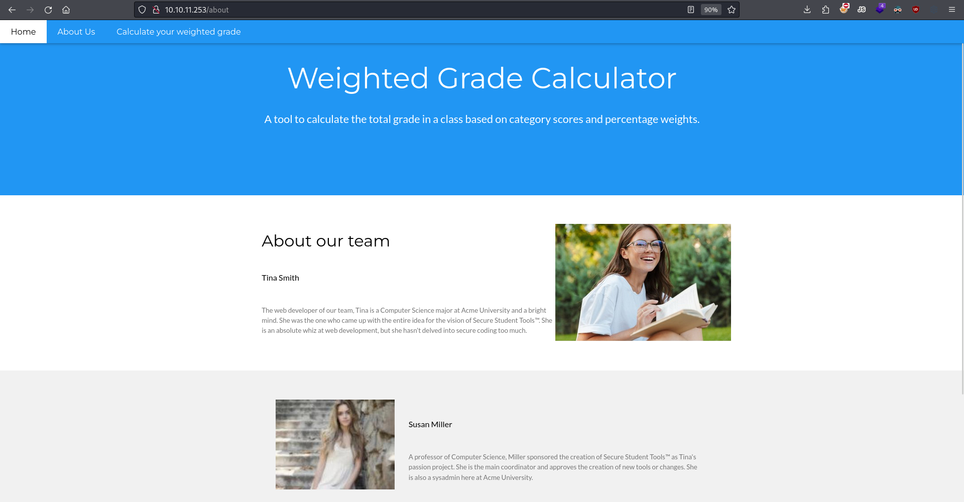 - Tina Smith, the web developer. The description suggests that she lacks proficiency in secure coding, indicating potential security vulnerabilities in the site’s features.