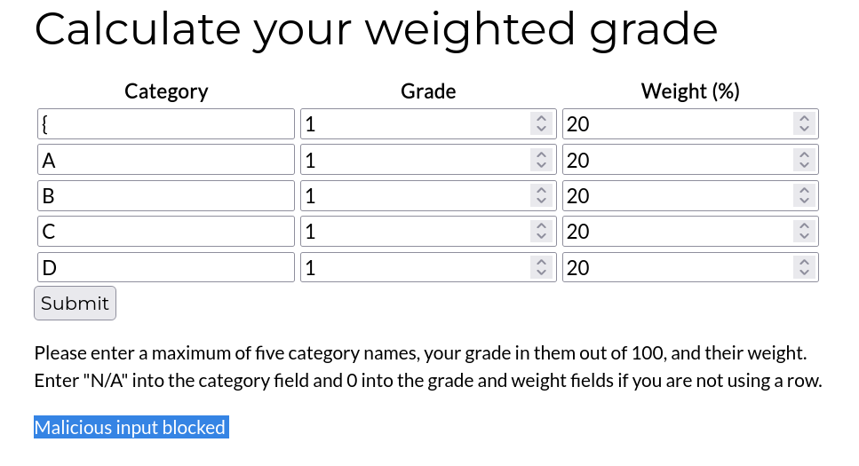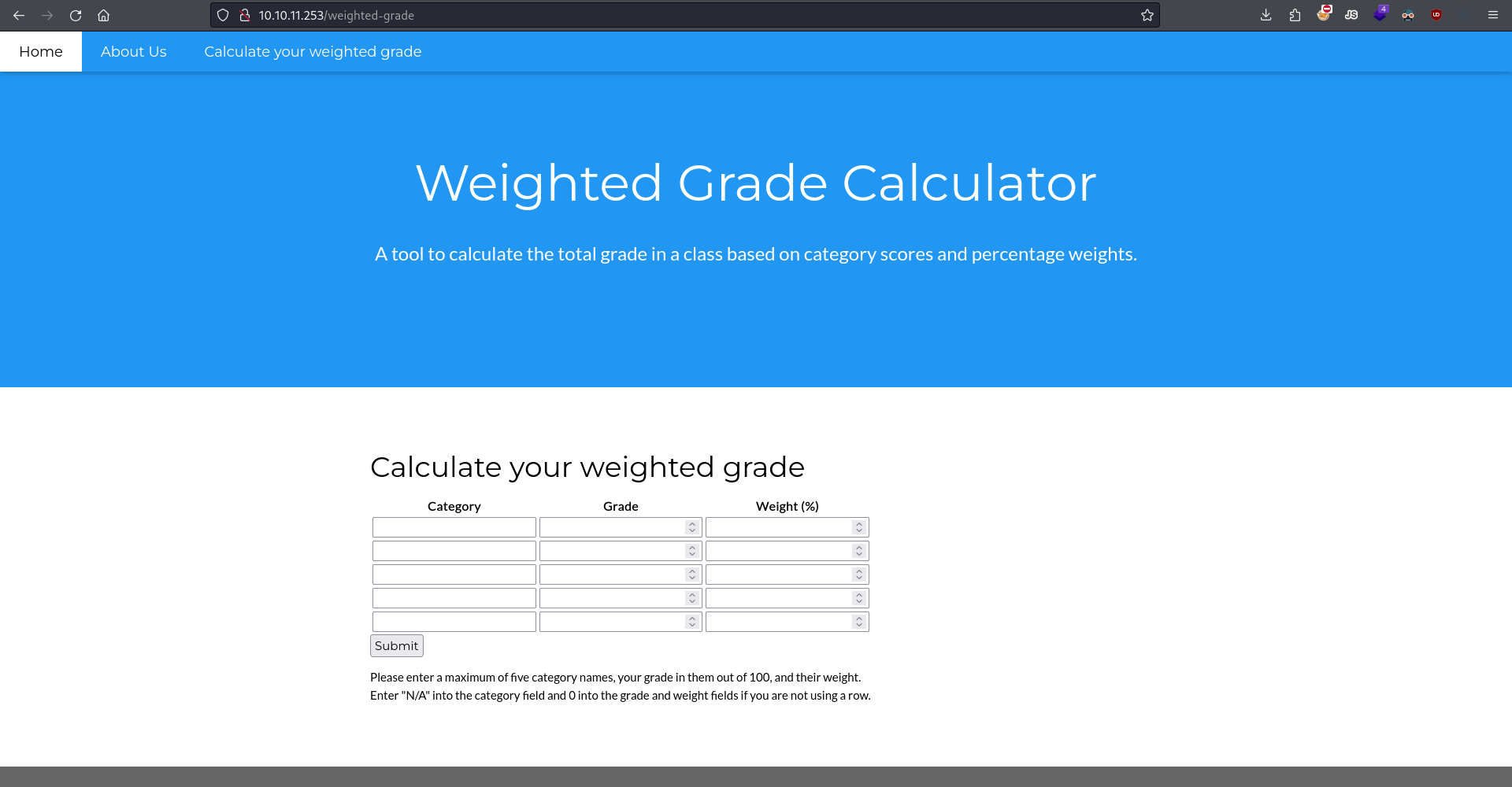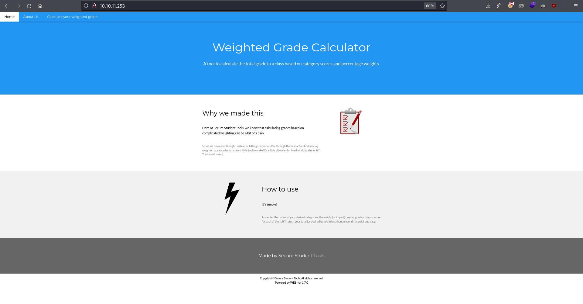 Accessing port 80 in our browser, we encounter a website for a weighted grade calculator created by an organization named Secure Student Tools.