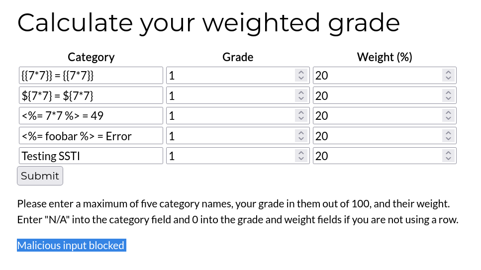 This machine hosts a Ruby HTTP server running a weighted grade calculator with improper input sanitization, which leads to a Server-Side Template Injection (SSTI) vulnerability.